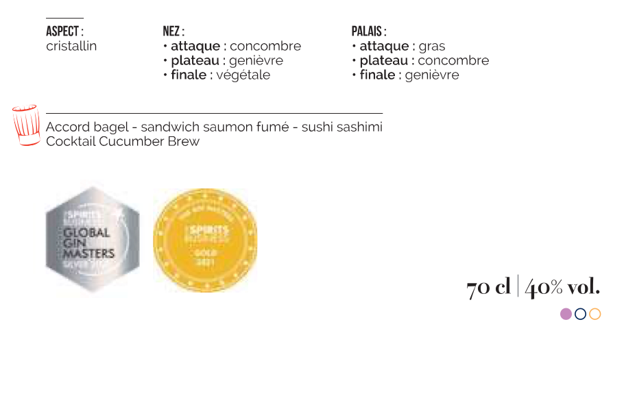 L'assemblage de ce GIN est composé de Baies de Genièvre et de concombre distillé au Québec. Et une jolie infusion de Bois de Cassis confrère au GIN structure et caractère.