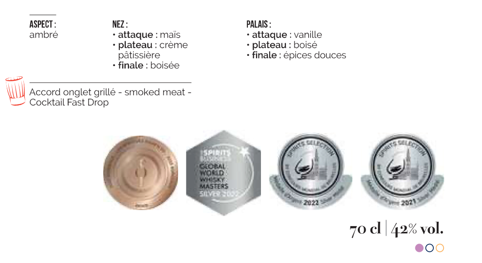 - Une création qui repose principalement sur le maïs, caractéristique emblématique des bourbons. Un mélange de maïs (80%), de blé (10%) et d'orge (10%) cultivé à Saint-Constant dans la région de Montégérie. Le moût obtenu est soumis à une double distillation dans un alambic Charantais avant d'être méticuleusement vieilli pendant 3 ans dans des fûts de chêne blanc.